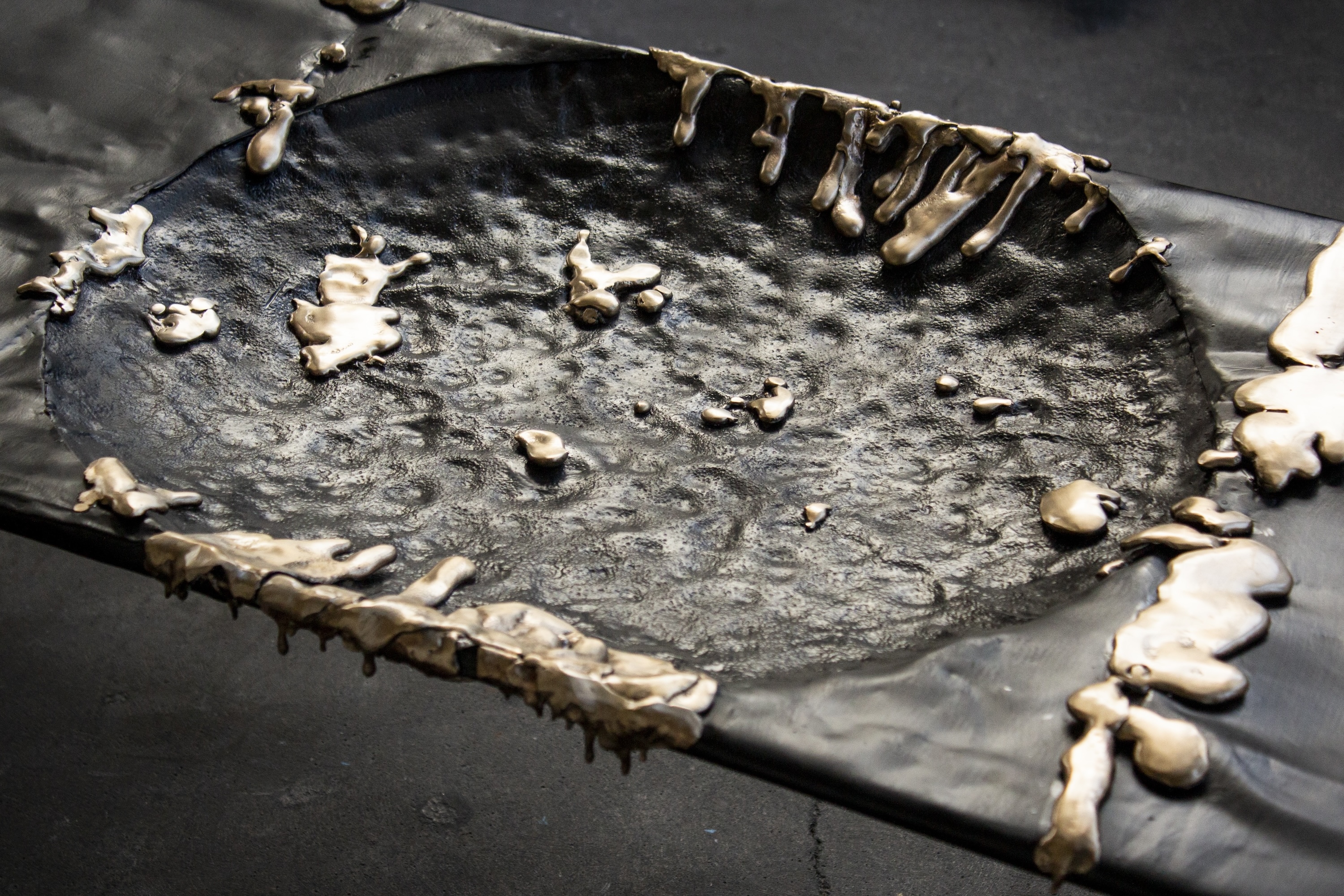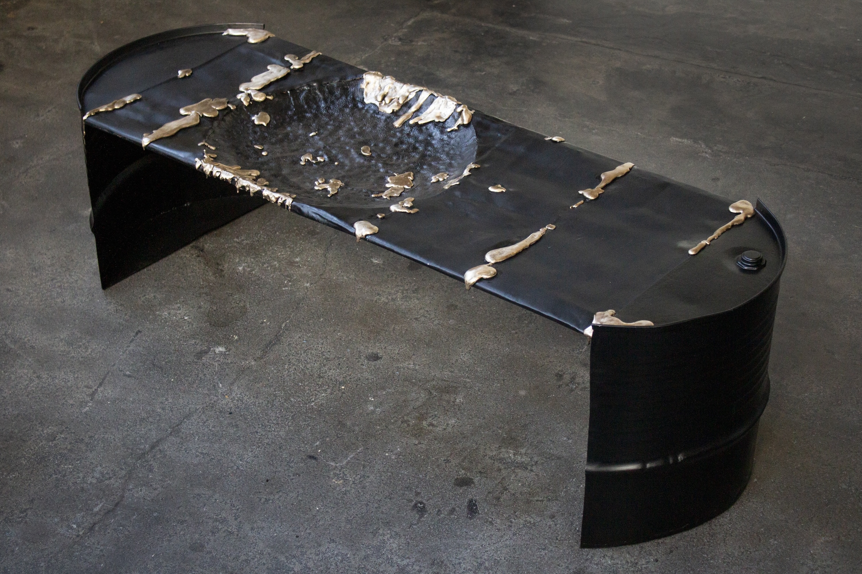 Bottom of the Barrel is conceived from two discarded industrial barrels collected in Providence, RI. The barrels were transformed into a table and serving bowl and finished by free pouring molten bronze organically along the surfaces.